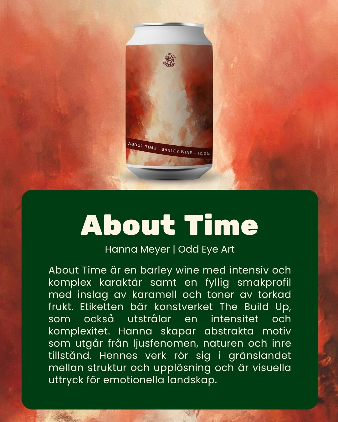 Hyllie Bryggeri släpper sin första Barley Wine; About Time. En barley wine som bjuder på en tydligt komplex maltprofil med stora, intensiva smaker och burkens konstverk är skapad av konstnären Hanna Meyer @oddeyeartstore.