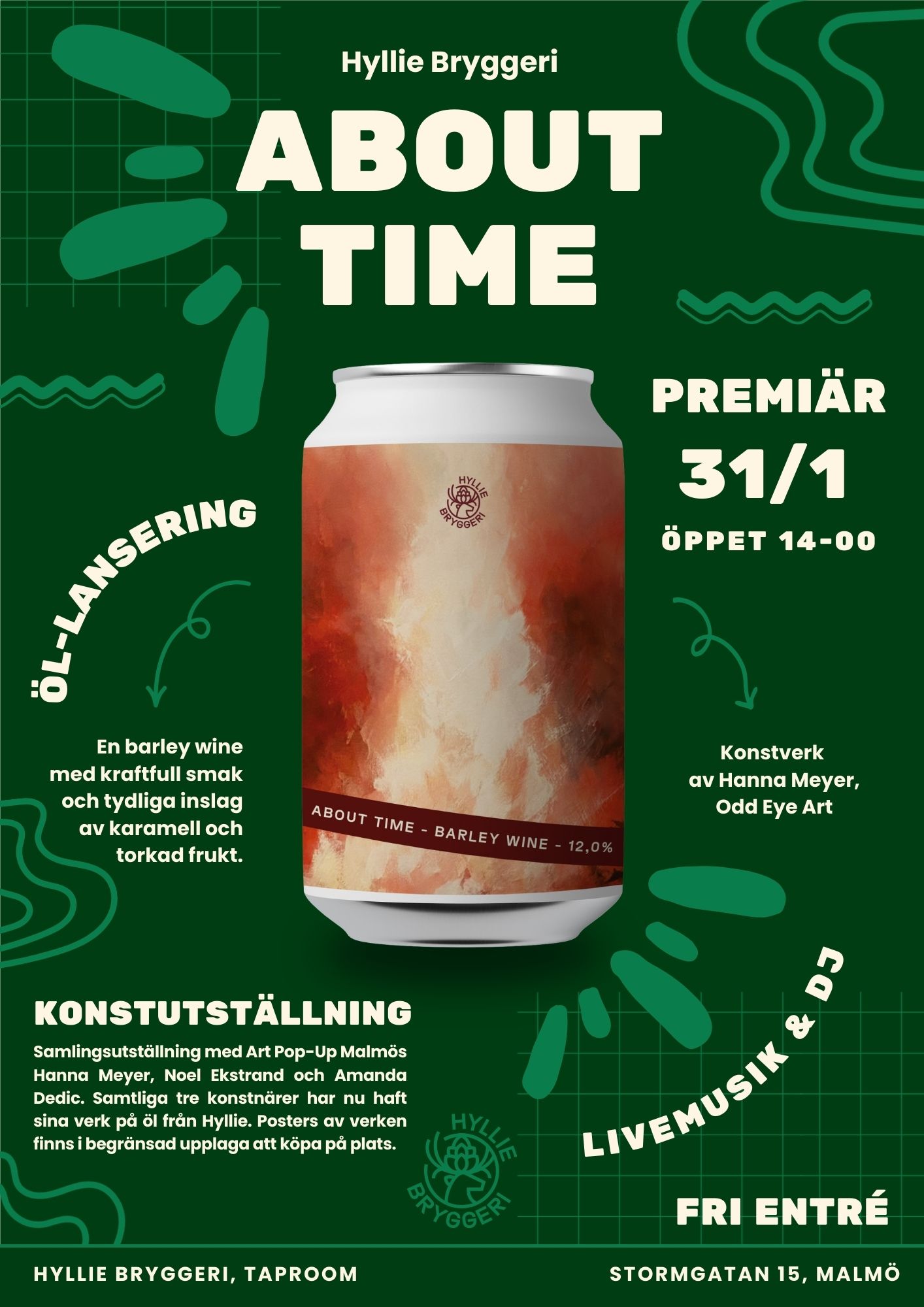 Den 31 januari lanseras ölet och samtidigt håller Hanna Meyer, Noel Ekstrand och Amanda Dedic – trion bakom Art Pop-Up – en samlingsutställning på plats. Noel och Amanda har tidigare haft sina verk på burkar från Hyllie Bryggeri, och under kvällen kommer alla tre konstverk även att finnas som signerade posters i begränsad upplaga till försäljning.