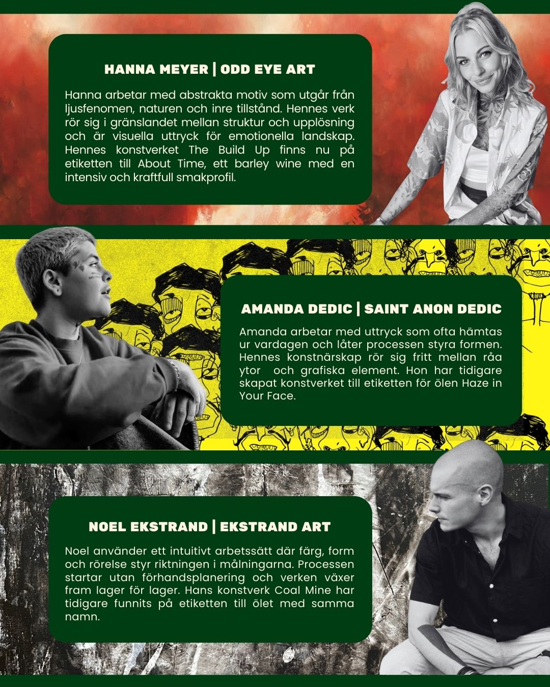 Lisa Lindahl ställde ut sina keramikskulpturer som speglar mänskligheten på olika sätt. Noel Ekstrand visade sina intuitiva abstrakta målningar. Hanna Meyer presenterade abstrakta målningar inspirerade av naturens ljus och energier. Frida Halvardson visade abstrakt konst med fokus på kvinnors former och styrka. André Guldhjärta kombinerade måleri och popkonstskulpturer med motiv av sin ikoniska katt. Jesper Wänberg visade sina målningar och skulpturer skapade av harts och kaffebönor.